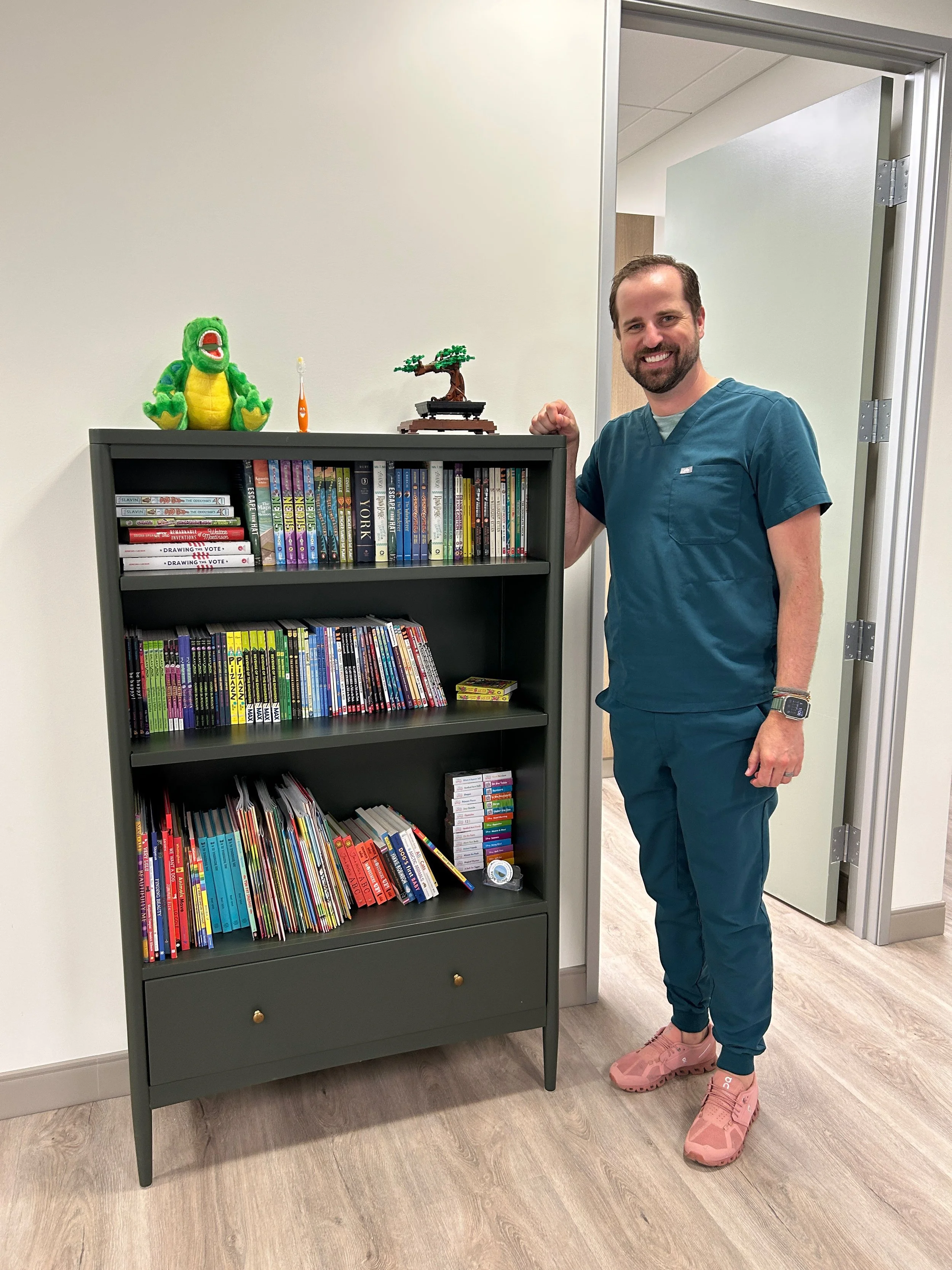 CS: I was inspired to do this by a previous mentor. As a family we always found the little toys that are usually given only last a few minutes and just end up in the trash. We wanted to provide something with a bit more long-lasting value to the families we work with. Every time a child comes to the office for an appointment, they choose a book off of our shelf to take home and keep. We try to keep the options interesting so there is always something different for each visit. We have books for every age; from board books, picture books, early readers, middle grade, and even some young adult chapter books. The collection is always changing to keep it fresh.